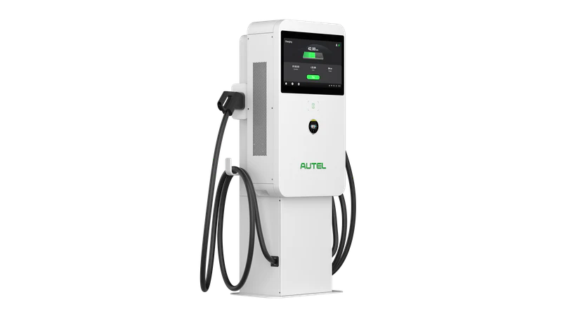 The Autel Maxicharger 50kW dual CCS tethered charger is a 3-phase commercial DC charging unit, featuring two CCS guns and mounted on a pedestal.